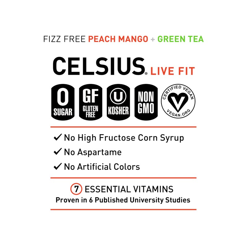 CELSIUS is functional, Essential Energy, a better-for-you, premium alternative to traditional energy drinks. As a global, lifestyle fitness drink, CELSIUS was created to help people LIVE FIT, exceed their goals and elevate their everyday lives. Made with proven, premium ingredients, 7 Essential Vitamins and zero sugar, no artificial colors, no aspartame, no high fructose corn syrup and non-GMO. CELSIUS is vegan, gluten-free and Kosher. Our proprietary MetaPlus blend contains green tea extract with EGCG. It also includes guarana seed extract, ginger root for flavor and digestion, vitamin C to help support your immune system, vitamin B for energy production, and chromium to help control hunger, making it an ideal pre-workout drink. Non-carbonated CELSIUS Peach Mango Green Tea combines the tropical sweetness of mangos and juicy, vibrant peaches without all the bubbles. Reminiscent of a brisk, refreshing peach iced tea. Made with clinically proven ingredients, this carbonated flavor of CELSIUS has the perfect balance of flavor and energy that serves as an awesome pick-me-up for active lifestyles. Make CELSIUS your go-to choice for Essential Energy! CELSIUS is available in 12 oz. slim cans and sold in a 12-pack for convenience.