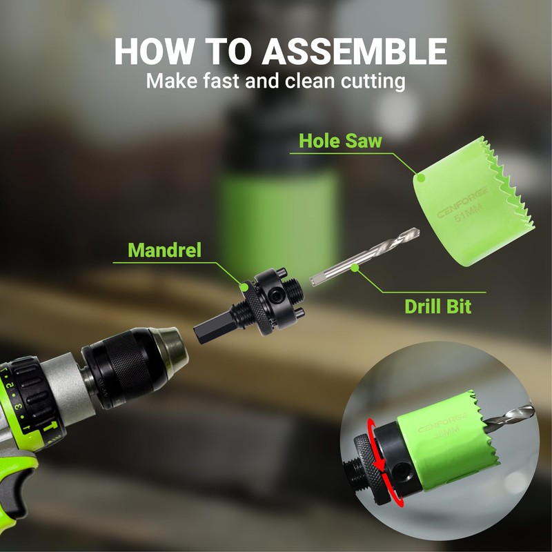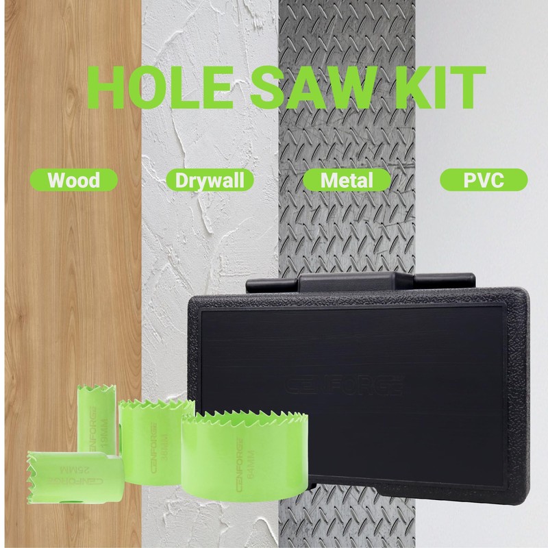 Cenforge Bi-Metal Hole Saw Kit, HoleSaw Set with 3/4" to 2-1/2" (19-64mm) Saw Blades, Mandrels, Hex Key, Drill Bit, Hole Saw for Wood, Metal, Drywall, PVC