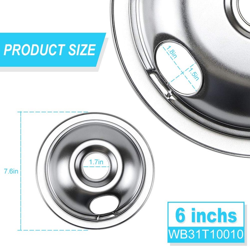 - ➽[ FIT STOVE PERFECTLY ]: 6inch WB31T10010 and 8inch WB31T10011 Electric stove burner drip pans fits most Whirl-pool G-E Hot-point and Ken-more most plug-in electric ranges cooktops.The chrome stove drip pans can fit the stove properly and prevent swinging drip pan elements, thus preventing cookware from rocking on the stove. If your old g-e electric stove burner drip pans is dirty or rusted, this replacement can fix it and keep your stove looking like new.