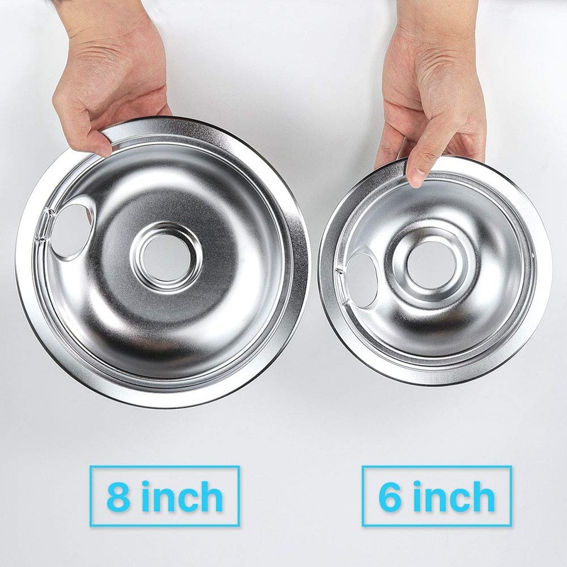 - ➽[ DRIP PANS SET INCLUDE ]: Includes 2 x WB31T10010 (6'' chrome burner drip pans ) measured 7.6" in diameter and 2 x WB31T10011 (8'' chrome oven burner drip pans ) measured 9.8" in diameter. The electric stove drip pans are made from Durable Chrome Plated Steel, using eco-friendly plating techniques. Oven burner drip pans is easy to install without the need for professional tools.
