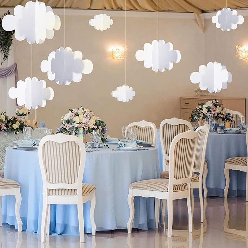 - These cloud wall decor pieces are designed to resemble clouds and create a 3D effect when unfolded. In combination with our ropes, they can be easily attached to the wall or ceiling and add a realistic and beautiful touch to your party atmosphere.
