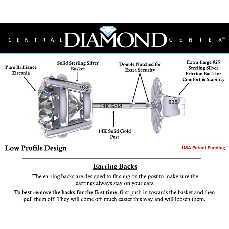 Central Diamond Center 14K Solid Gold Post & Sterling Silver 4 Prong CZ Stud Earrings - Platinum Plated - 4.5mm - 0.80cttw