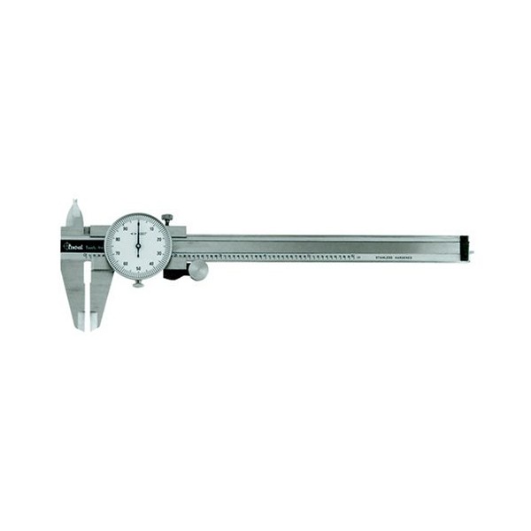 Four measurements; inside, outside, depth and step. This particular dial caliper is made of stainless steel and is stress relieved. Measuring surfaces are precision-ground and lapped. The dial indicator has a fine line indicating hand. It has a very unique and sleek design.