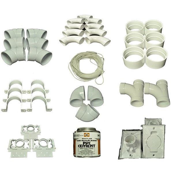 - 3 Inlet Instillation Kit Assembly, contains, 9 Sweep 90 degree Ells, 2 Sweep 90 degree Tees, 3 short 90 degree Ells, 6 - 45 degree Ells, 6 couplings, 6 pipe straps, 3 inlet valves, 3 mounting plates, 80 feet 18/2 low voltage wire, 8oz PVC cement