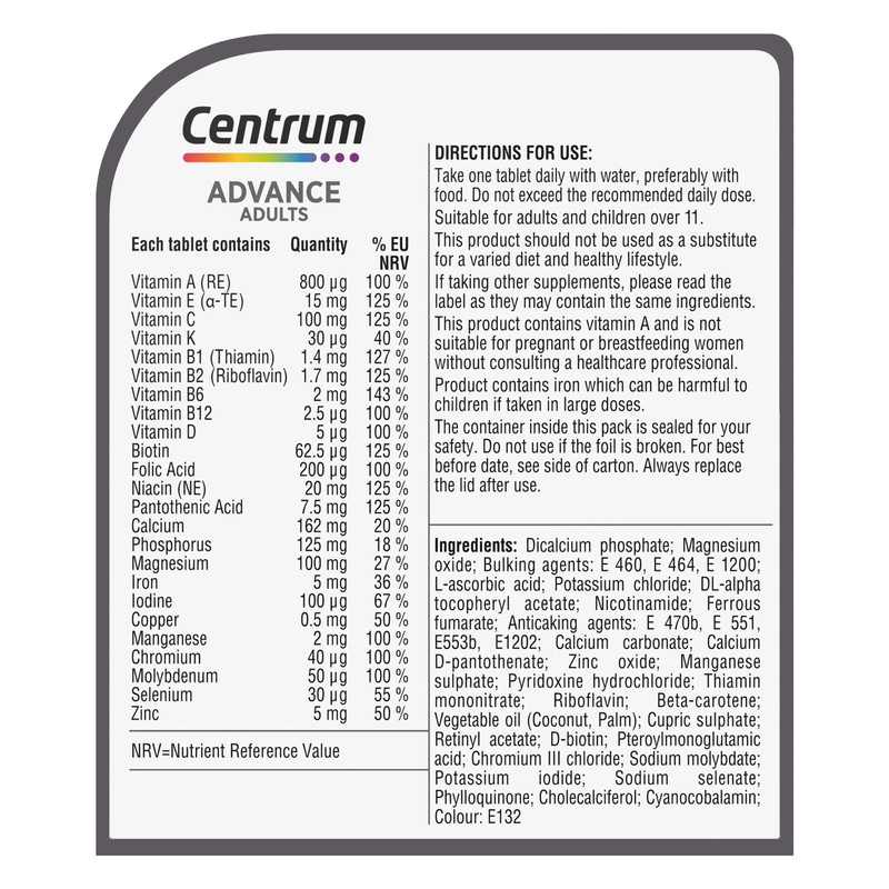 - Centrum Advance contains vitamins B2 and B6 to help unlock energy from food.