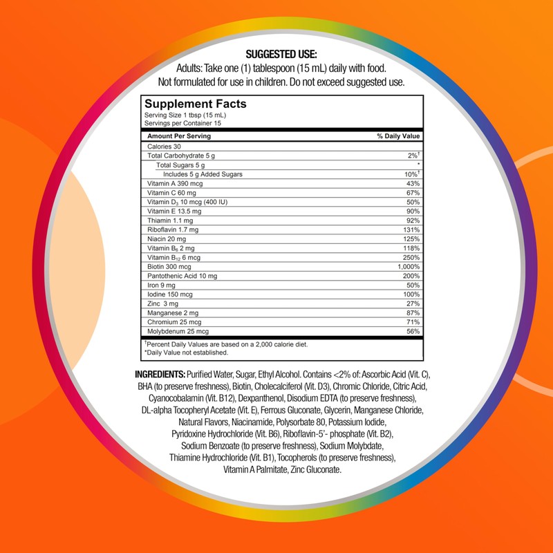 • Liquid multivitamin iron supplement with vitamins B, C, E, beta-carotene and zinc