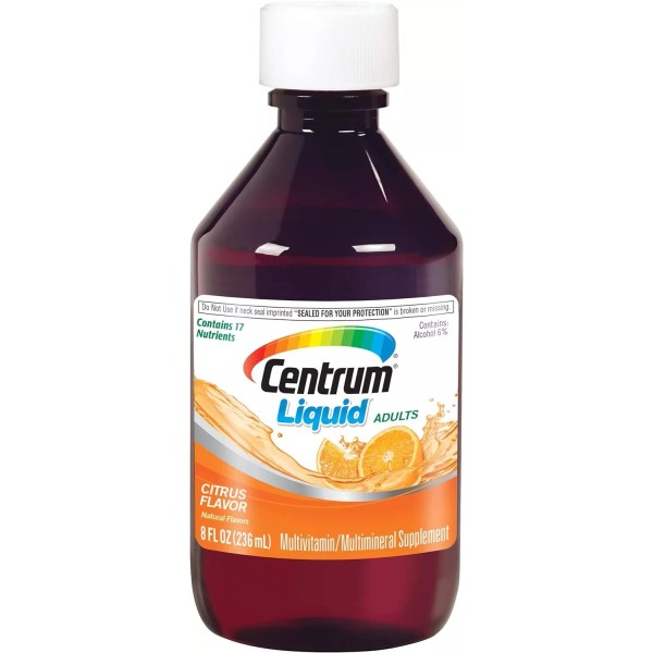 - One 8 fl oz bottle of citrus-flavored Centrum Liquid Multivitamin for Adults, Multivitamin/Multimineral Supplement with B Vitamins and Antioxidants
