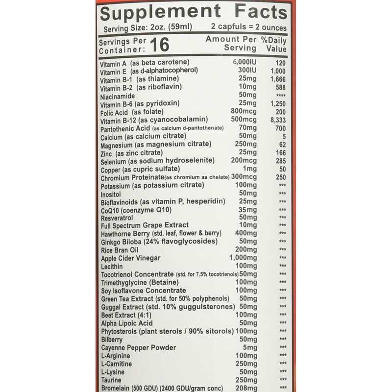 - Ingredients: Apple Cider Vinegar, Potassium Citrate, Lecithin, Calcium Citrate, Vitamin B12, Zinc, Vitamin A, Trans-Resveratrol, Sodium, Vitamin E, Vitamin B1 (Thiamine), Magnesium, Selenium, Green Tea, Vitamin B6