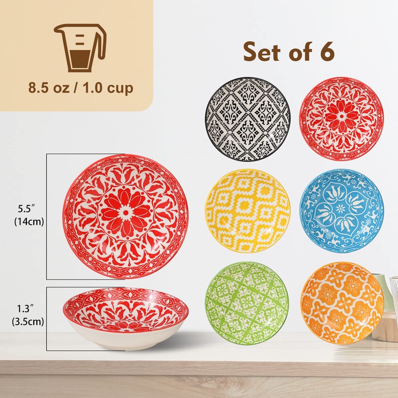 Ceramic Cat Food Bowl Set - Wide Shallow Cat Bowl for Relief Whisker Fatigue - Colorful Cat Feeding Bowls - Flat Cat Dish - Cat Plates - Microwave and Dishwasher Safe - 8.5 oz - 5.75 inch - Set of 6