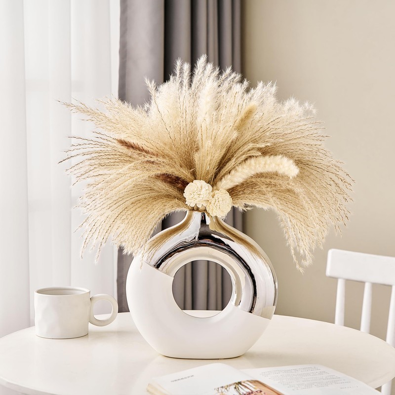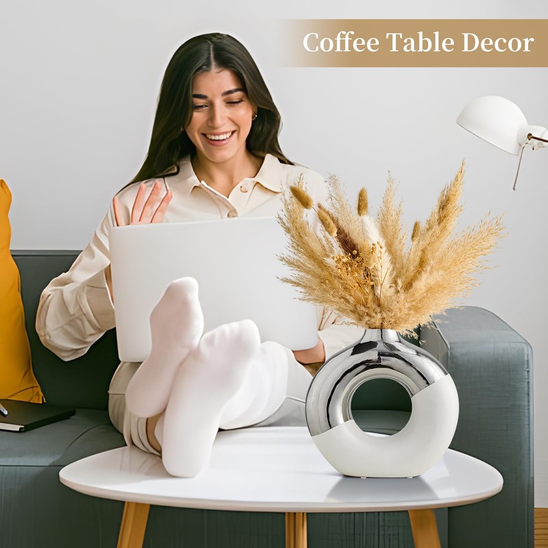 - 【MULTI-PURPOSE DONUT VASE】 This ceramic donut vase will hold pampas grass, dried flowers, reeds, fresh flowers, succulents and more nicely, and also be a white and silver vases centerpiece for your living room, bedroom, desk, office, wedding, bookshelf. The two-color design of the donut vase makes the vase beautiful with or without flowers, and it will add a beautiful artistic landscape to your home decor.