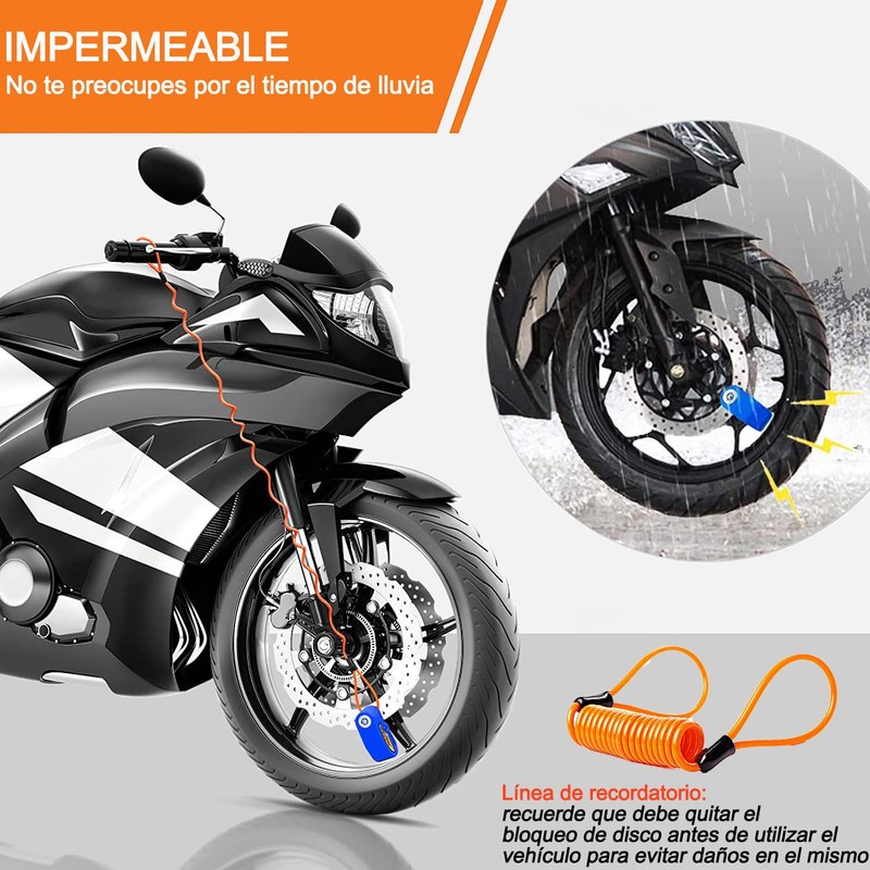 - 【Con cable recordatorio】 Esta cerradura de freno de disco viene con un cable recordatorio de cerradura de disco naranja llamativo de 1,3 m para recordarle que debe quitar la cerradura de disco antes de usar su motocicleta o bicicleta para evitar el daño potencial de montar su bicicleta mientras la cerradura de disco está activada.