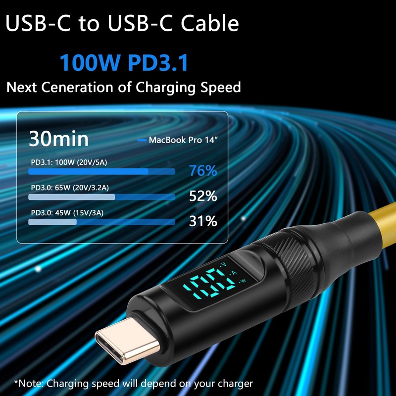 - Full-featured digital display PD3.1 USB C data cable, the plug has a small screen that can monitor current, voltage and power in real time (automatic switching in turns)