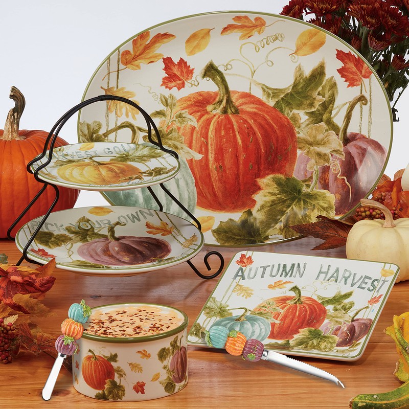 - Includes: Four Each: Autumn Harvest 11" Dinner Plates, 9" Salad/Dessert Plates, 16 oz. Mugs & 5.5" Ice Cream/Dessert Bowls