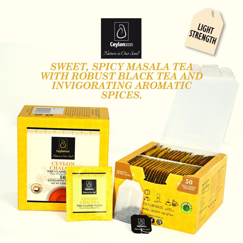 Ceylonzon Chai Tea Classic Taste 50 Individually Foil-Wrapped Tea Bags, Pure Ceylon Black Tea with Naturally Rich flavor & Spices, Spice Chai Latte Blend 80g