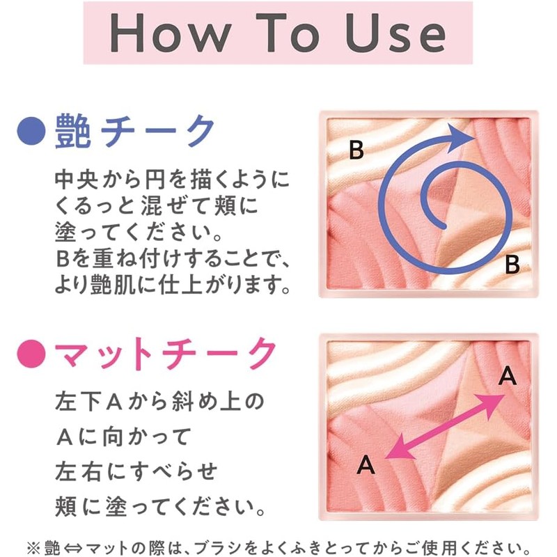 3 matte colors and 1 pearl color in 1 Depending on how you mix it, you can create a glossy or matte blush. Please wipe the brush thoroughly before using.