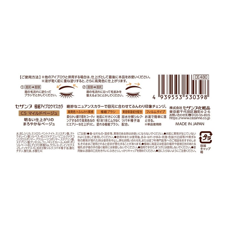 Cezanne Extra Fine Eyebrow Mascara, C5, Mild Beige, 0.1 oz (4 g), Ultra Fine Brush Nude Color Eyebrow Mascara