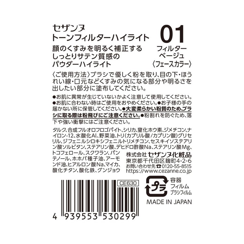 Cezanne Tone Filter Highlight 01 Filter Beige 2.3g Powder Highlighter to Brighten and Retouch Facial Dullness