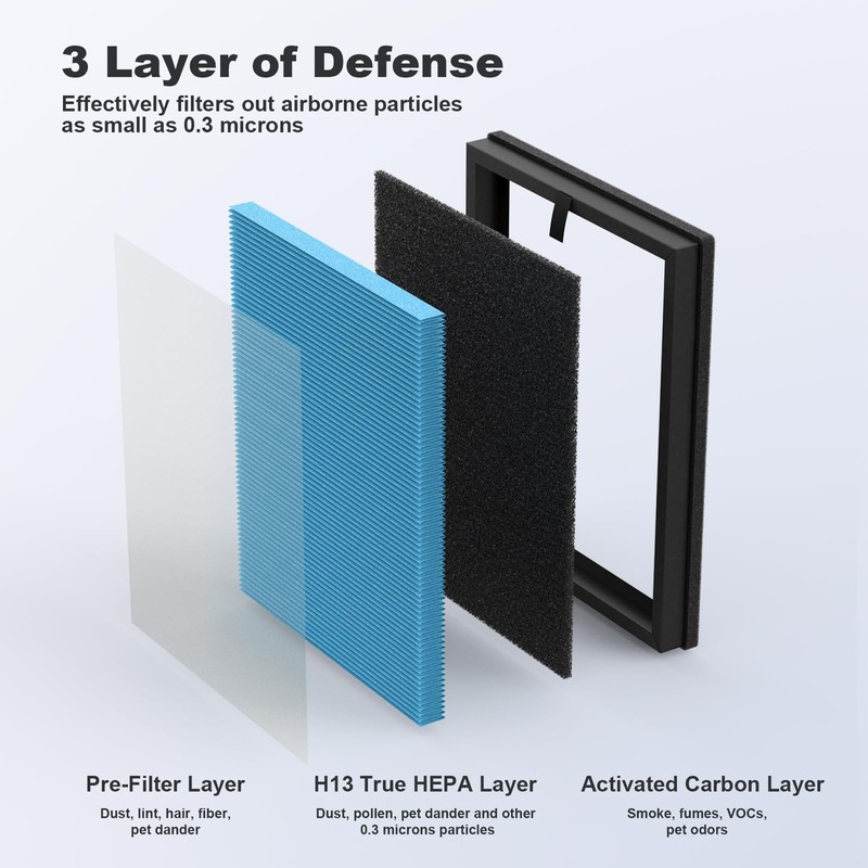 - H13 True HEPA captures up to 99.97 percent of airborne particles as small as 0.3 microns in size including smoke, dust, pollen, pet hair and dander