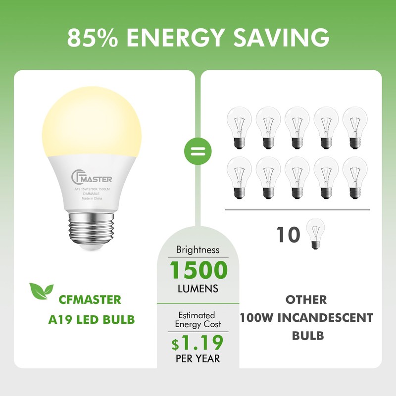 - Energy Efficient:Lower your electricity usage by 85% when you replace your 100 watt incandescent light bulb with a 15W A19 E26 base LED bulb. CFMASTER's A19 LED bulbs are a sustainable choice by offering a longer life time than traditional bulbs to reduce maintenance
