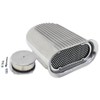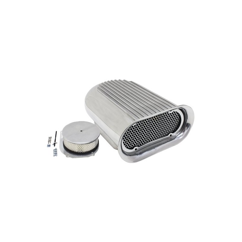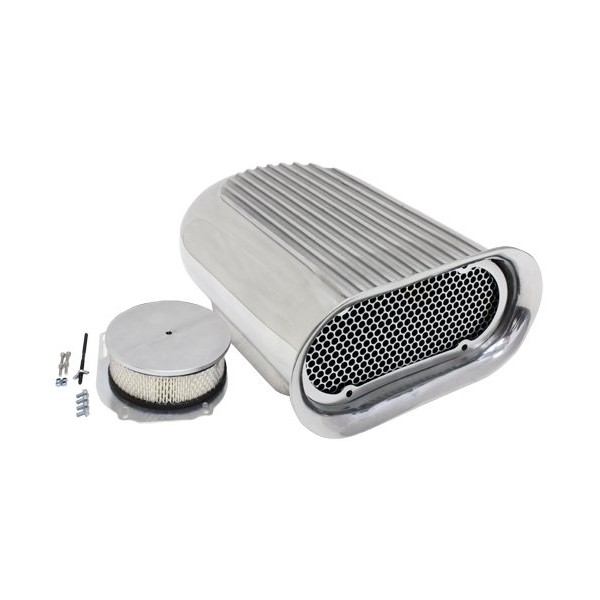 Brand new finned polished aluminum hood scoop. This item will fit most single 4 barrel carburetors in hilborn style.