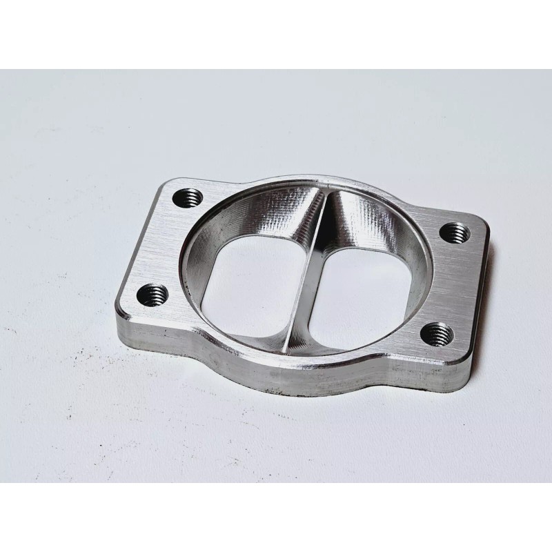 All our products are CNC milled using the latest CAD/CAM programs which are built in house on 3 and 4 axis high precision machinery. We offer the billet flanges in custom thickness and even custom application transitions for easier fab work or building your own DIY kits. We guarantee our products and service if you are not satisfied return the product and receive the purchase price refund. We machine out adapters and flanges with the industry standards by using USA certified materials to resist warping and provides excellent weldabilty. The turbo adapters' ports are all ballmilled to improve flow smoothly from one port shape to the other reducing resistance and turbulence. We also even go the extra distance to sand down the machine waves using a hatch cross pattern to improve sealing.