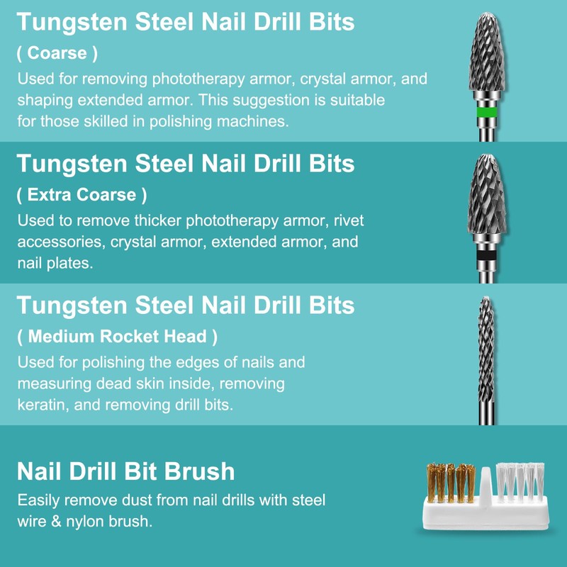 - 【5 Grit Nail Drill Bit Set】The nail drill bits set includes 5 grit nail drills (XF, F, M, C, XC), 1 medium rocket head drill and cleaning brush designed for quick nail removal and cuticle removal. Suitable for professional nail technicians or nail beginners.