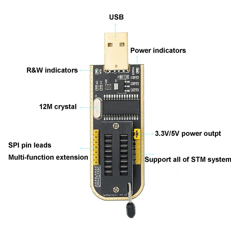 - CH341A programmer output voltage: output voltage signal level can be selected 3.3V or 5V