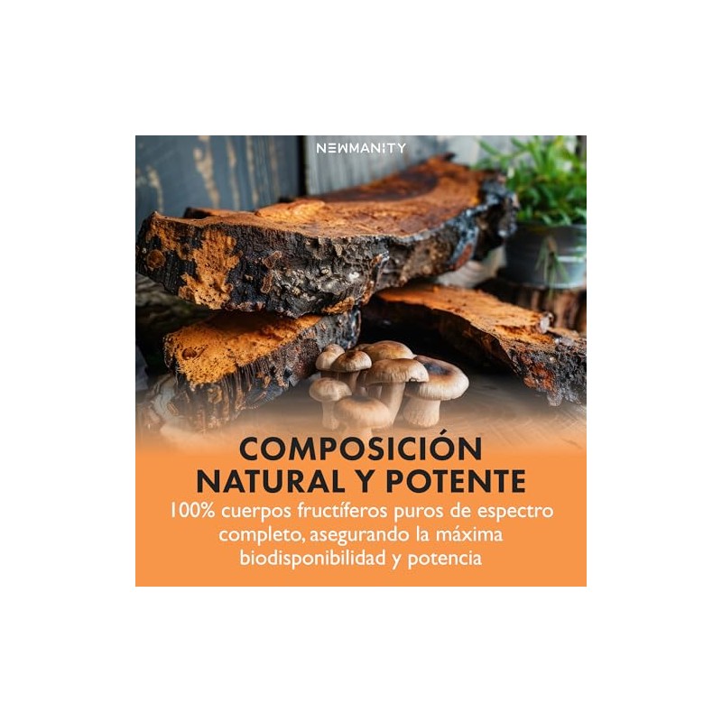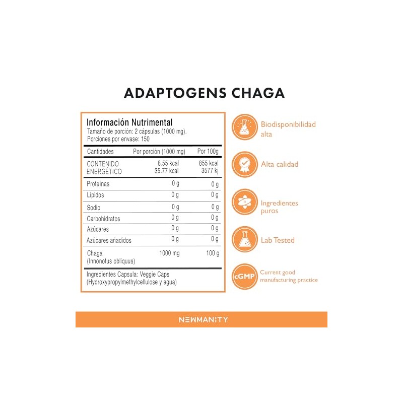 - Alta biodisponibilidad: Proceso de extracción dual que garantiza una mayor absorción. Cada dosis de 1,000 mg proporciona un soporte adaptógeno eficaz, aprovechando lo mejor del Chaga.