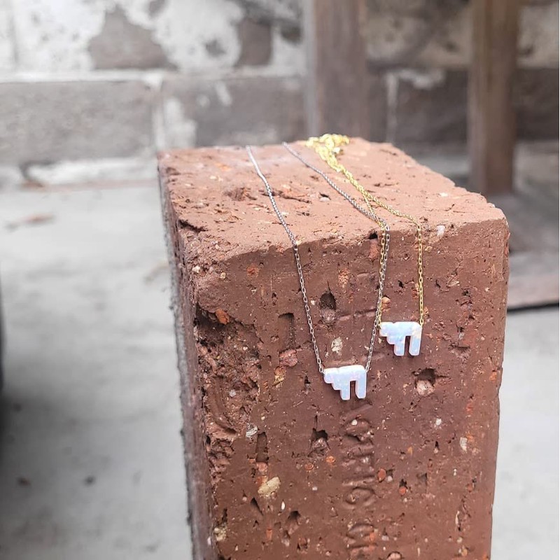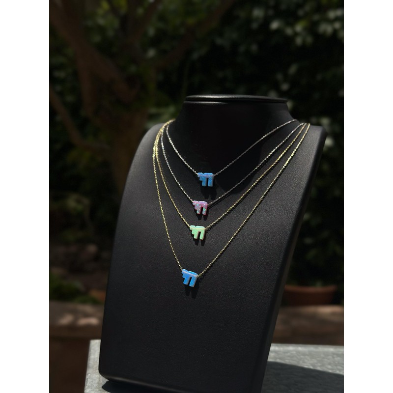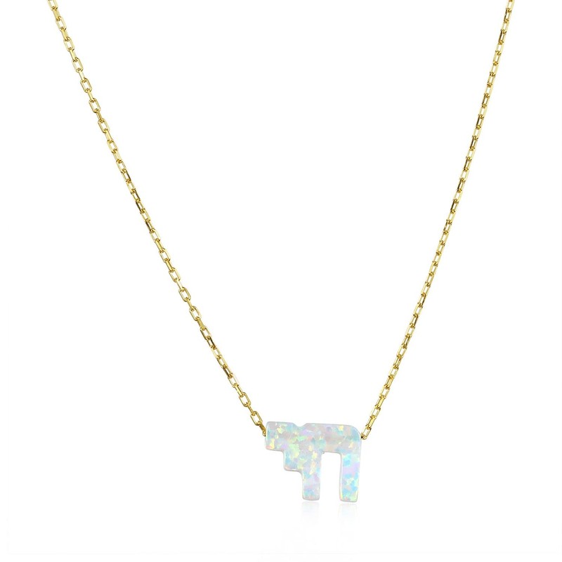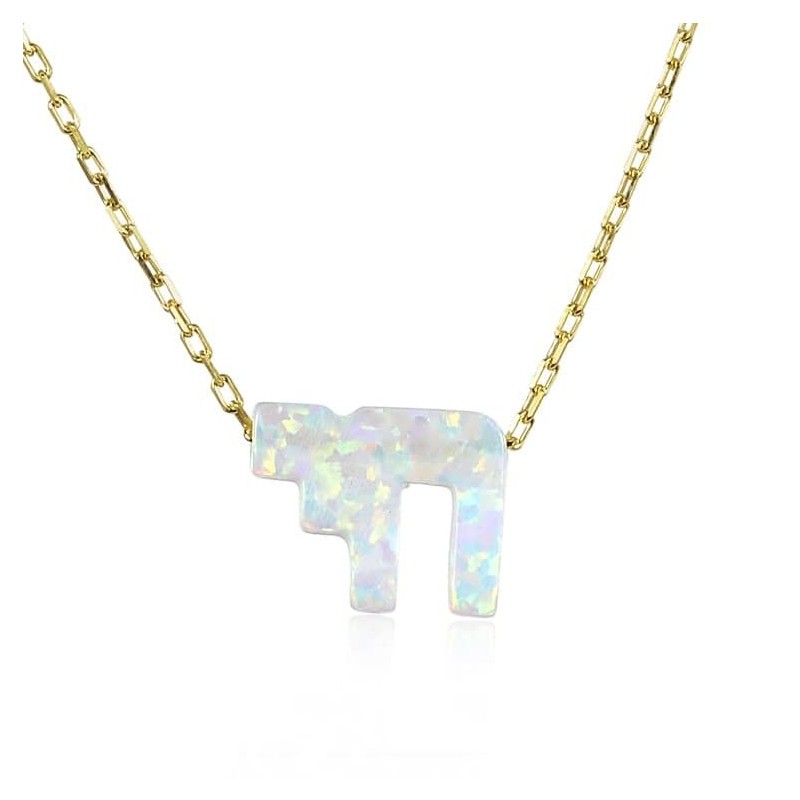 Chai Hebrew Letter Necklace Crafted in Synthetic White Opal on Gold Chain