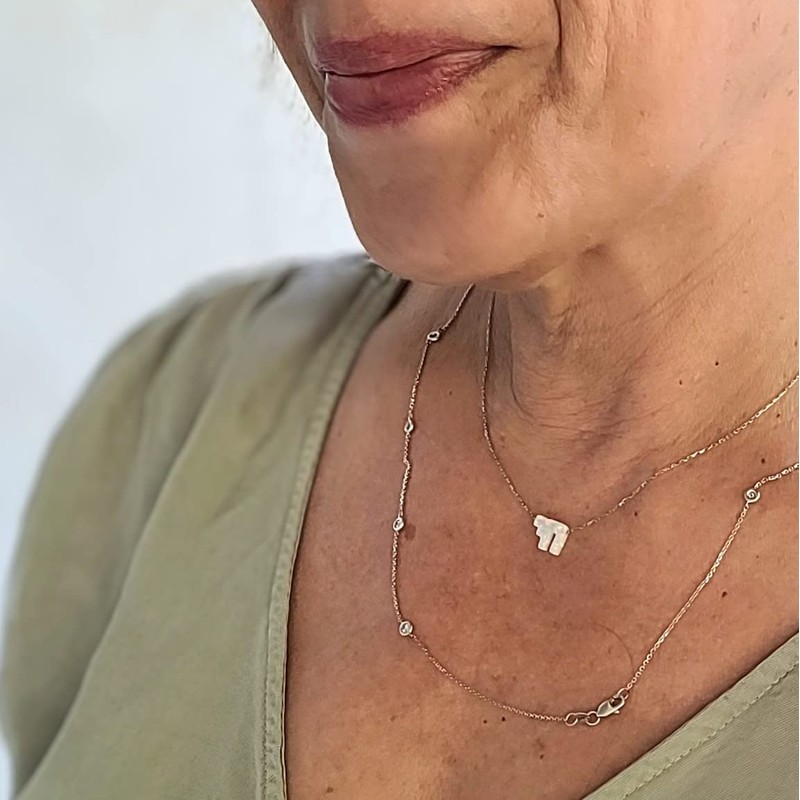 - Chai Hebrew symbolic charm in sterling silver and white synthetic opal. It measures 3/8” x 3/8" and is strung on a 16" rolo chain with a 2" extender.