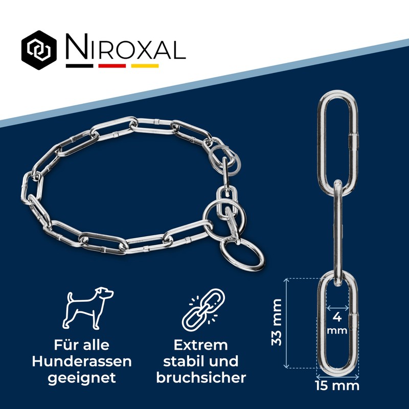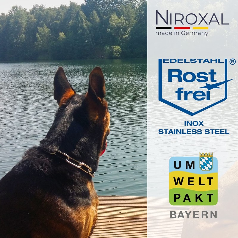 - The original with pull stop – now also on Amazon: the stainless dog chains from NietFullThings and niroxal. Our dog collar made of high-quality V4A stainless steel with additional passivation is rust-proof and protects your dog's coat. Collars without pull stop (pull limit) can be dangerous