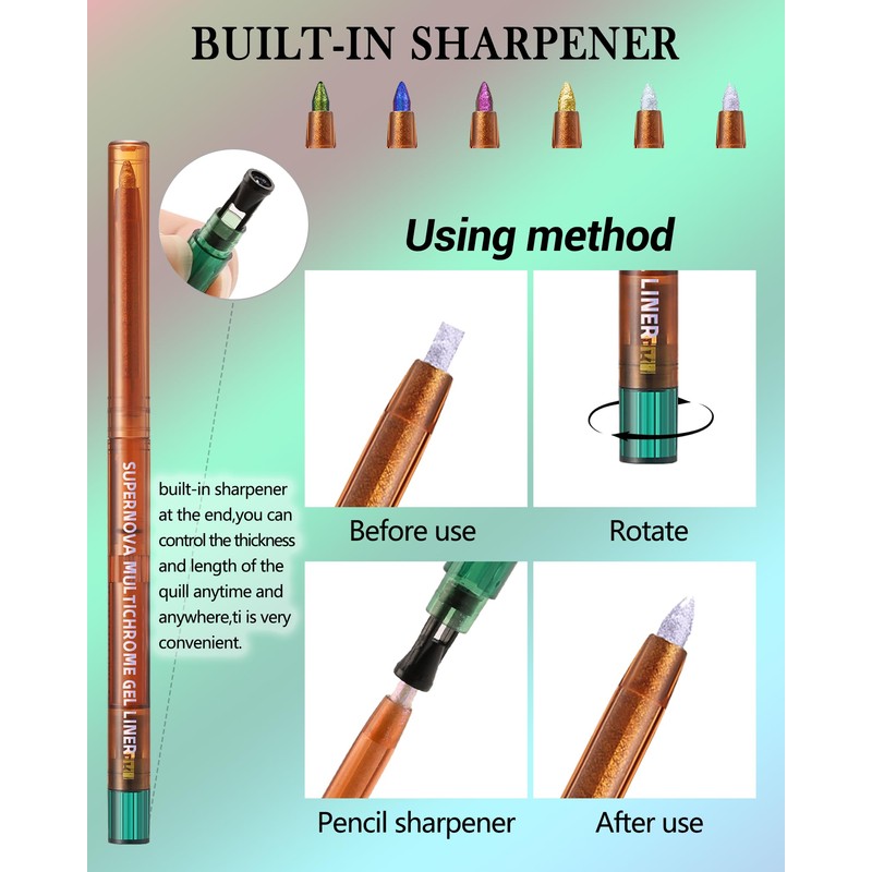 - Multi-Purpose: This is a multi-purpose eye makeup product, you can use it as an eyeliner or an eye shadow, and the unique highly pigmented mixture can change colors according to the angle of light, bringing you a rainbow eye makeup effect.