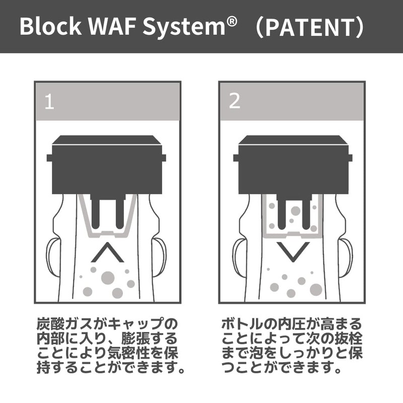 Block WAF System is a proprietary patented technology that is "Brevetti Waf" based on physical laws. It applies the principle of the pressure on the liquid is transmitted equally in all directions. This principle is that carbonated gas enters through the holes in the protrusion of the stopper and inflates against the inside of the bottleneck, where the inside is overpressed. This system shows that the internal pressure of sparkling wine bottles will vary almost 72 hours at a constant temperature and remain the same time even after several months of months The retainer is also designed to combat the vertical thrust received by the stopper, and can hold a seal of 6 ATM or more.