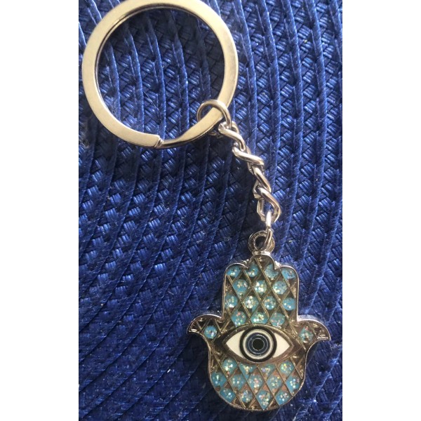 Metal Blue Chamsa Protective Mystical Eye Hamsa Key Chain with Travelers Prayer Hebrew Tefillat Haderet