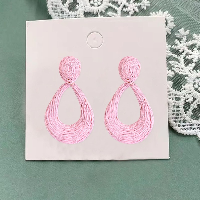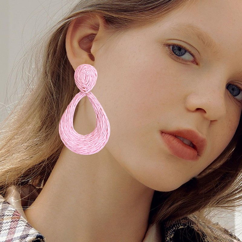 Chanaiqw Teardrop Handmade Statement Raffia Earrings Cute Boho Rattan Dangle Lightweight Straw Wrap Summer Drop Dangling Earrings for Women (Pink)
