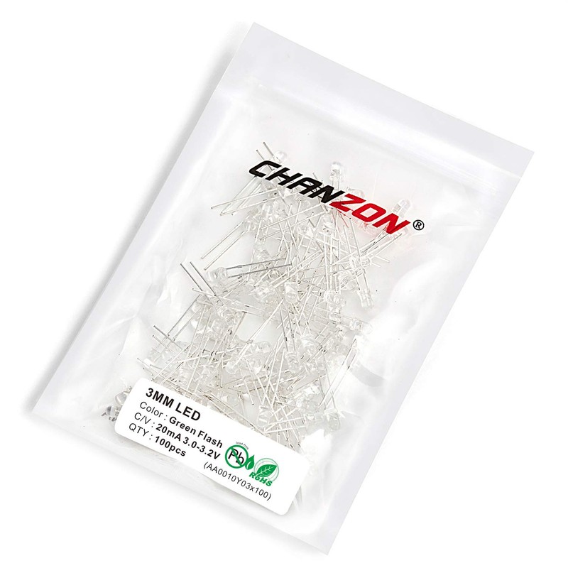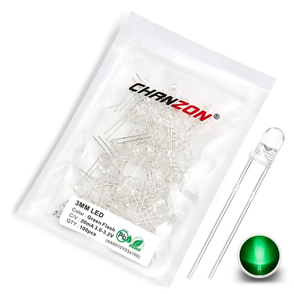 Chanzon 100 pcs 3mm Blinking Green LED Diode Lights 1.5Hz Flashing (Clear Round Transparent DC 3V 20mA) Bright Lighting Bulb Lamps Electronics Components Indicator Light Emitting Diodes