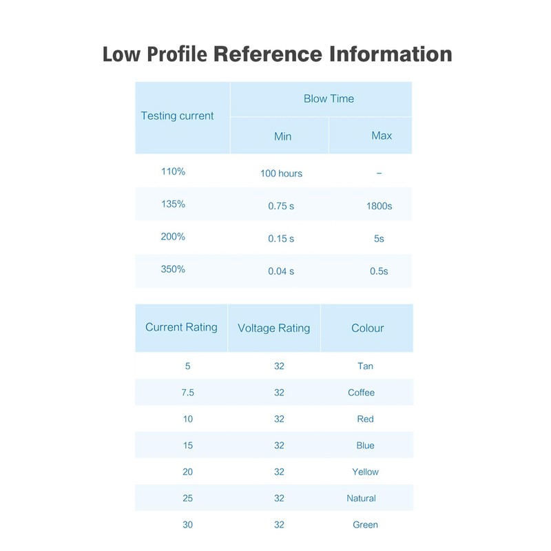 - 【Product Details】Voltage:32V(24V 12V), Current Rating: 25 A,Cutoff (Quick Acting) Time: See Picture, Size:10.9mmx8.73mmx3.81mm,Operating Temperature:-40℃ - +125℃