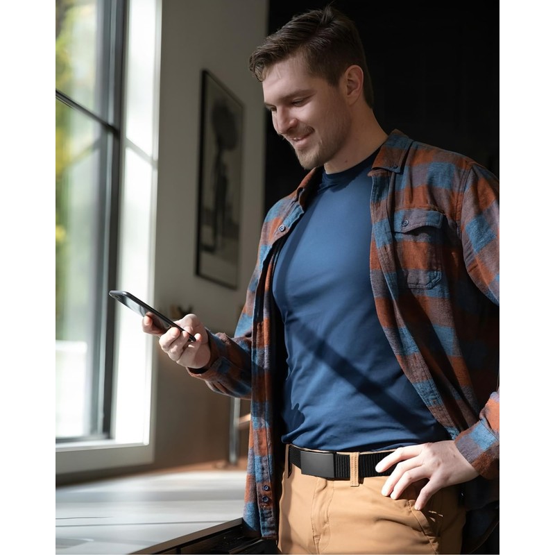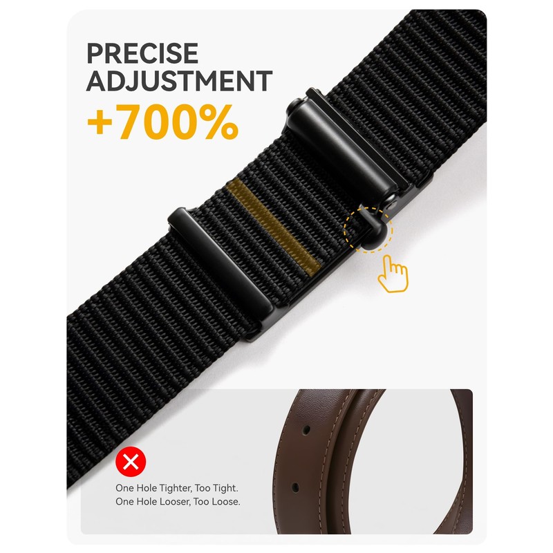 - Easy Adjustable Fit - CHAOREN's adjustable belts for men feature an automatic ratchet buckle for precise 1/7" micro-adjustments. Slide and pull for a secure fit—no more pin holes, just perfect comfort every time. Ideal for work, golf, or outdoor adventures.