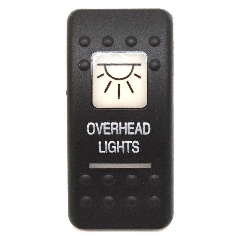 This actuator is constructed out of black plastic and measures approximately 1 7/8" W x 1" H overall. Features the words "OVERHEAD LIGHTS" in white lettering on the body of the actuator and an icon of a semicircle and radiating lines in the opaque white square lens.