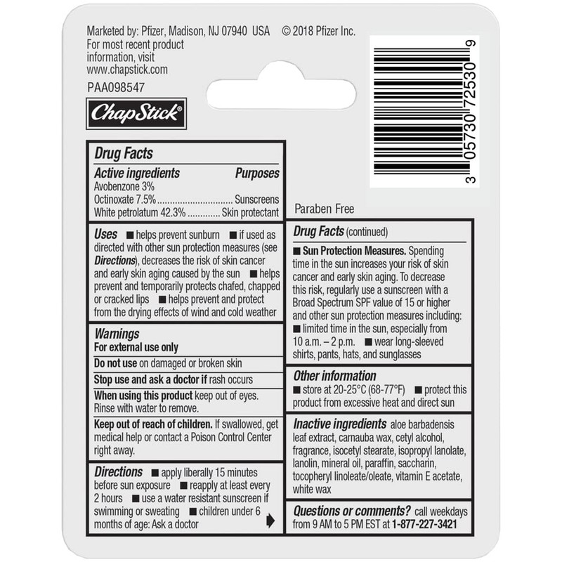 ChapStick Moisturizer Original Lip Balm Tubes are an SPF and skin protectant featuring an ultra-hydrating formula that softens and protects your lips at the same time. Unscented and unflavored, this Original ChapStick is a lip moisturizer. This moisturizing lip balm comes packaged in .-ounce tubes that are portable and easy to apply, so you'll always have lip sun protection in a pinch. ChapStick Moisturizer -in- lip care delivers broad spectrum SPF protection whether you're out for a day at the beach or going for a walk. The ultra-hydrating formula also provides up to eight hours of moisture with ingredients like aloe and vitamin E. Keep this non-tinted, paraben free lip balm in your pocket, purse or drawer whenever your lips are feeling chafed, chapped or cracked, and apply as needed. This ChapStick pack keeps you stocked and hydrated for longer.