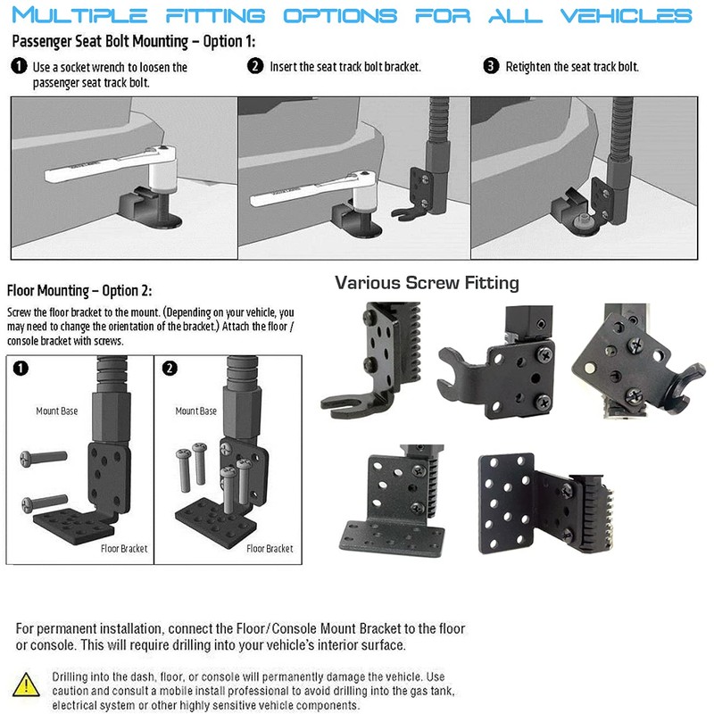 - HEAVY DUTY - Our Mount is a heavy duty floor pedestal mounting solution for Tablets & Smartphone of all sizes. It is designed to install directly on the passenger seat's front left mounting screws. The FlexPro allows the driver to strategically position the tablet to the right of the center console.