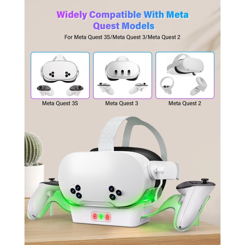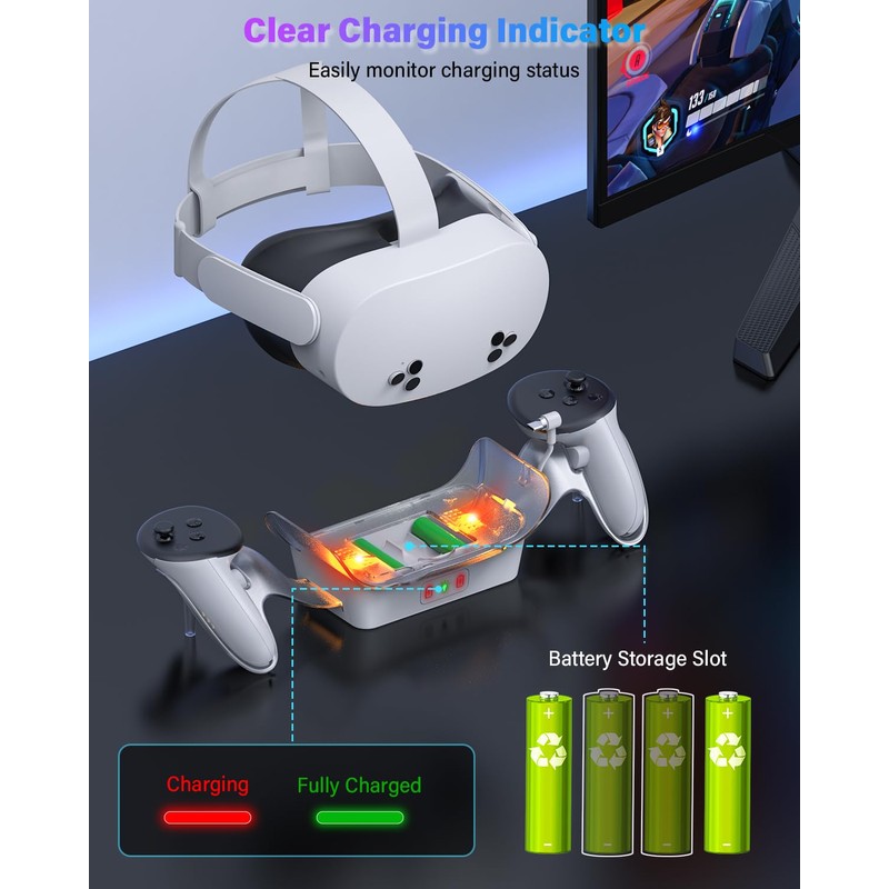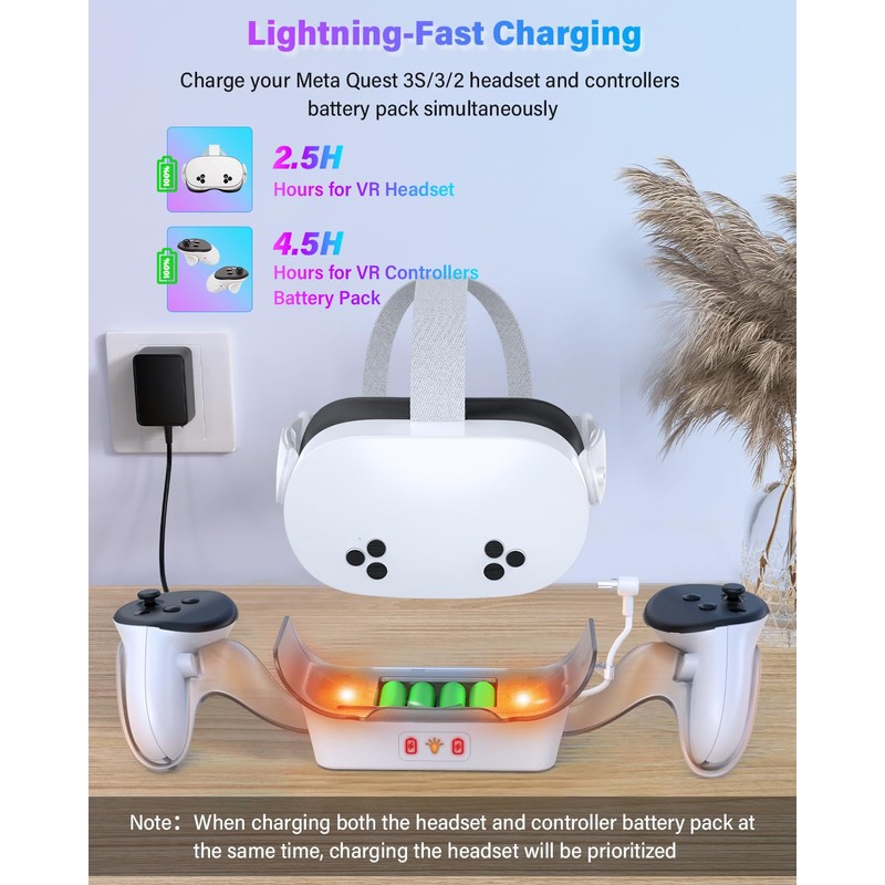 - Fast Charging Dock for Meta Quest 3S/3/2: ZRZLMVP for Meta Quest 3 charging dock has been upgraded to become the Meta Quest 3s charging dock compatible with Meta Quest 3S/Quest 3/Quest 2, which can charge your headset and controller battery pack at the same time. The VR headset can be fully charged in 2.5 hours, and the controller battery packs can be fully charged in 4.5 hours. The charging dock prioritizes charging the headset, and once it is charged to 50%, it will start to power the controller battery packs