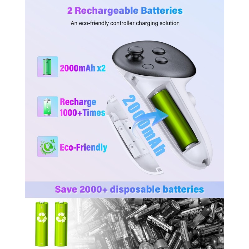 - 2 x 2000mAh Rechargeable Batteries for Quest 3S/3/2 Charging Station: The Oculus Quest 3 charging dock station comes with 2 X 2000mAh rechargeable large-capacity batteries that can be reused up to 1,000 times. This not only saves you money from constantly replacing batteries but also promotes a more environmentally friendly approach. Reusable batteries are not only cost-effective but also safer for the environment