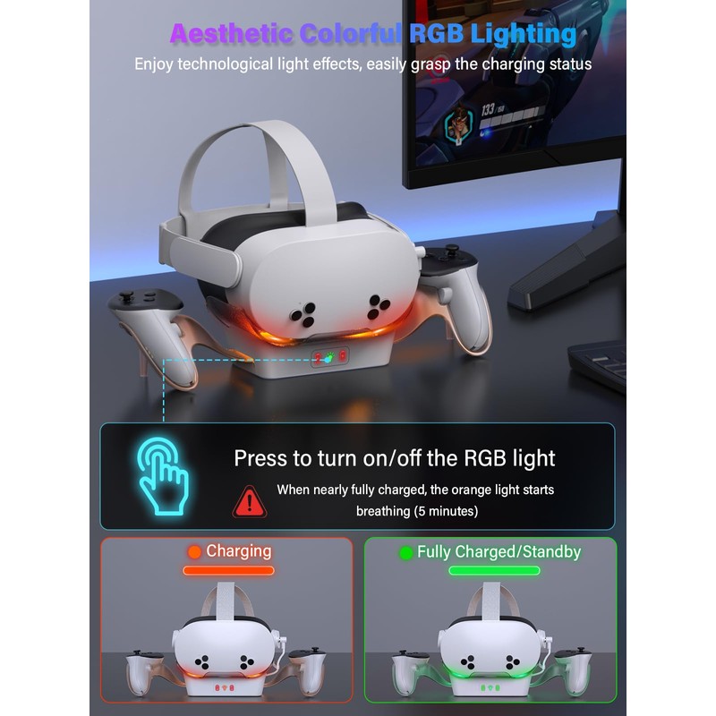 - Clear LED Indicators for Meta Quest 2 Charging Dock: The ZRZLMVP quest 3 charger dock is equipped with LED lights to indicate the charging status of the headset and two controller batteries. Headset LED Indicators: Charging, Orange Light; Fully Charged/Standby: Green Light. Controller Battery LED Indicators: Charging, Red Light; Fully Charged: Green Light. The LED indicator light not only shows the charging status of the Quest 3S/Quest 3/Quest 2 device, but it can also be turned off with one switch