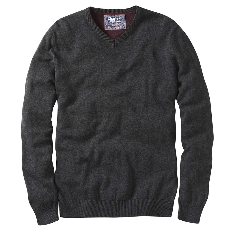 Charles Wilson Fine Knit Cotton Pullover with V-Neck for Men, Charcoal (0422)