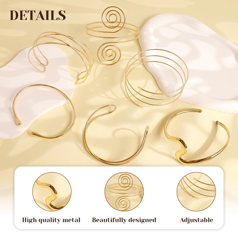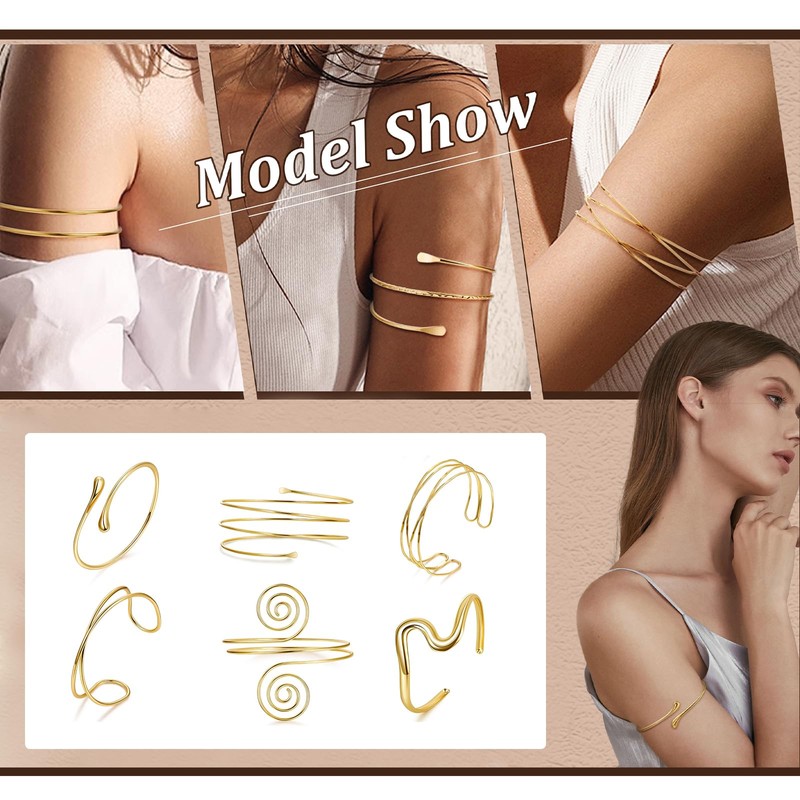 - Trendy set of 6 upper bracelets: this set contains 6 elegant gold upper bangles in different designs - including swirl, wave and layered style. They effortlessly bring shine to your outfit and are a real eye-catcher for festivals, parties or everyday life