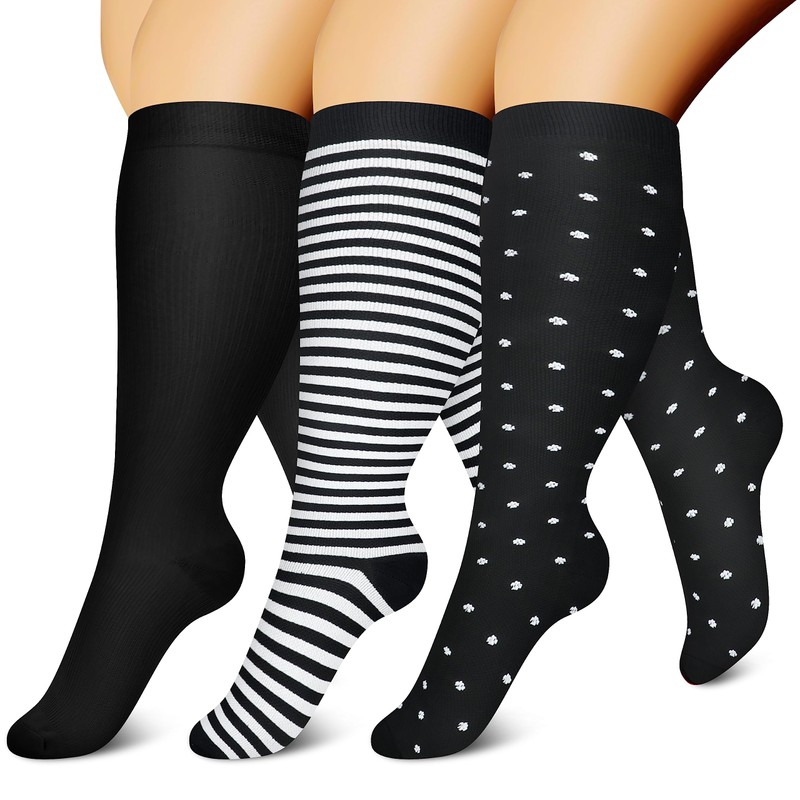 CHARMKING 3 Pairs Plus Size Compression Socks for Women & Men Extra Wide Calf 20-30 mmHg Best Support for Circulation, 06 Black/White/White, 5X-Large