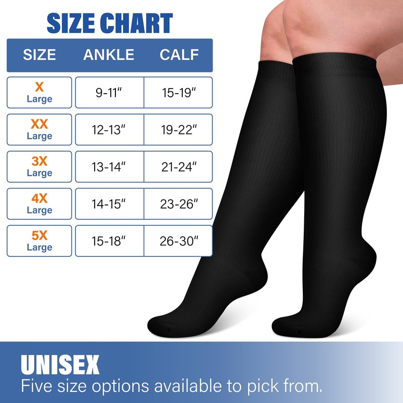- PLUS SIZE - CHARMKING's new compression socks are designed for men and women with plus and extra-large sizes, providing strong support and lasting comfort for your legs. The widened calf design offers more size options, ranging from XL to 5XL, with ankle sizes from 10 inches to 16 inches, and calf circumference from 15 inches to 28 inches (please refer to the last size chart).