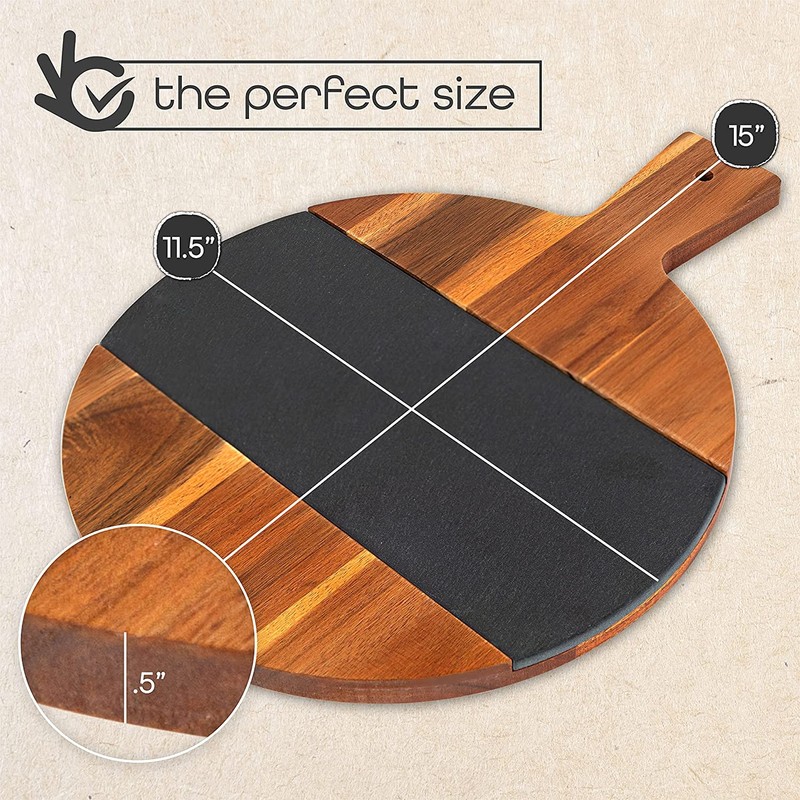 - Beautiful, Easy Entertaining: This elegant cheese board is crafted from real acacia hardwood with a removable real natural slate blade for better serving your guests; The circle wooden platter measures 11.5 inches in diameter and 1/2 inch thick with a handle making it easy to move from counter-top to table; It comes with 3 pieces of reusable slate cheese markers and white chalk to label your cheeses; Look like a pro and set a marvelous tone for your valentine party.