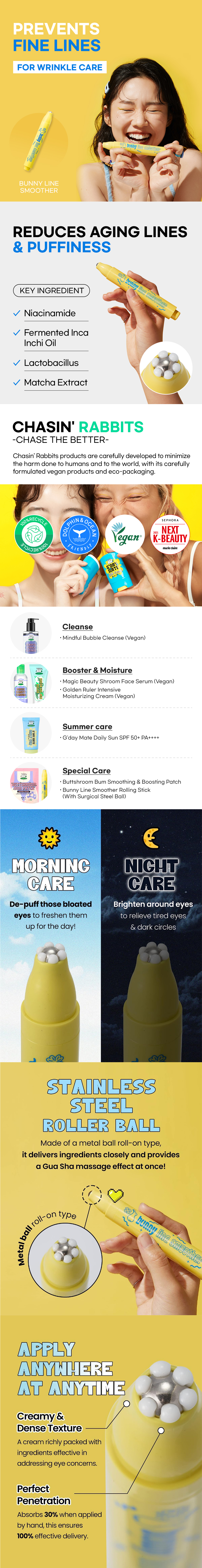 Bunny lines refer to wrinkles on the bridge of the nose (vertical wrinkles on the bridge of the nose, oblique wrinkles on the bridge of the nose), and wrinkles appear on their own when you frown or frown frequently. If your eyes are emphasized by the daily mask, or if you feel reluctant to make eye contact without realizing it, try using it. According to reviews, "I don't wear makeup because of the mask, so I don't even cover dark circles, but I believe in it and apply it hard because it has a whitening function!", "I dab it around my eyes whenever it feels dry!”, "It's comfortable to use without squeezing it on your hand, and it's absorbed refreshingly!", "The metal ball even gives you the perfect Gua Sha effect." Don't worry about dark and dull areas around your eyes that cannot be covered even with a mask. The Bunny Line Smoother is made of a metal ball roll-on type, so it can deliver ingredients closely and solve the Gua Sha effect at once. The metal ball closely adheres to the curved bunny line and the skin around the eyes and permeates firmly without stickiness to intensively care for wrinkles around the eyes and even cares for puffiness every morning. It has been tested for minor irritation so that it can be used safely around the sensitive eyes.